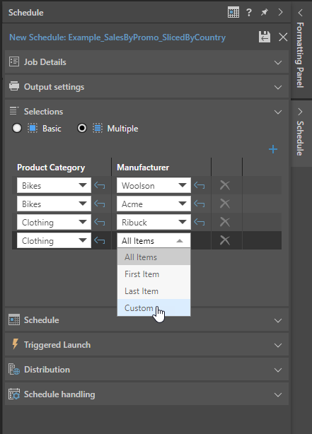 From the Selections section in the Schedule panel, choose Multiple, then select the slicer elements that should be used when rendering the report and looking up the distribution list. If your publication contains multiple slicers, you can choose "slice combinations" that each copy of the report should be filtered and sent by.