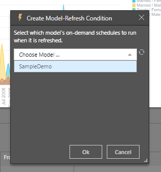 The drop-down list in the Create Model-Refresh Condition dialog shows all the underlying data models for the current content item; choose the required data model .