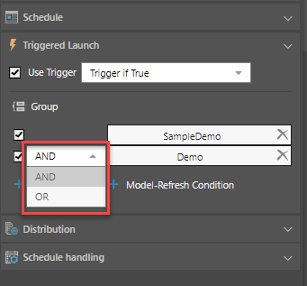 You can configure the Model-Refresh Condition trigger to run the schedule when one or more chosen data models are refreshed. You can combine this with other conditions to configure your triggered launch.