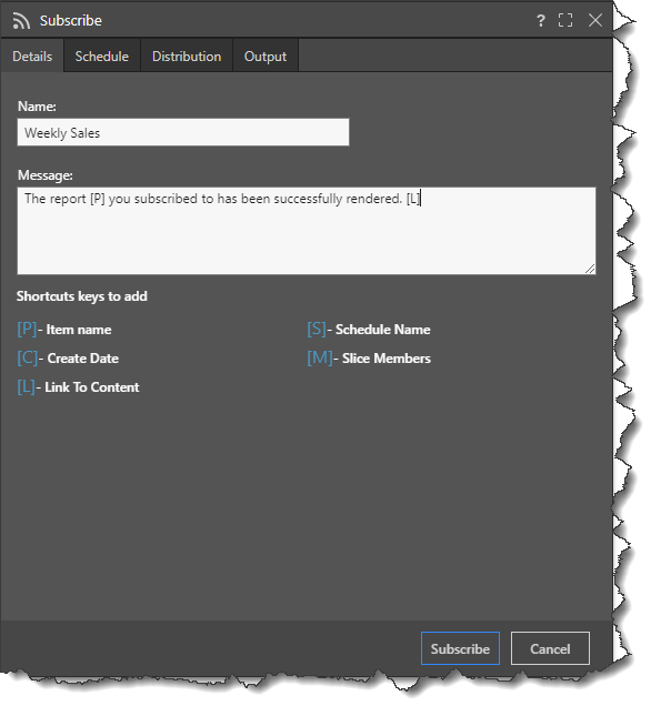 Recipients of subscriptions distributed via SMS will receive a templated message configured by the user who created the subscription.