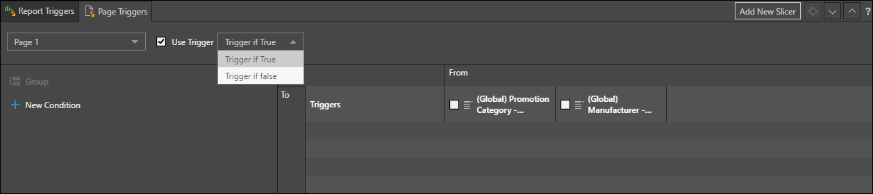 - Select the page for which you want to configure conditions and select "Use Trigger." Select either "Trigger if True" or "Trigger if False".