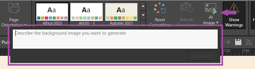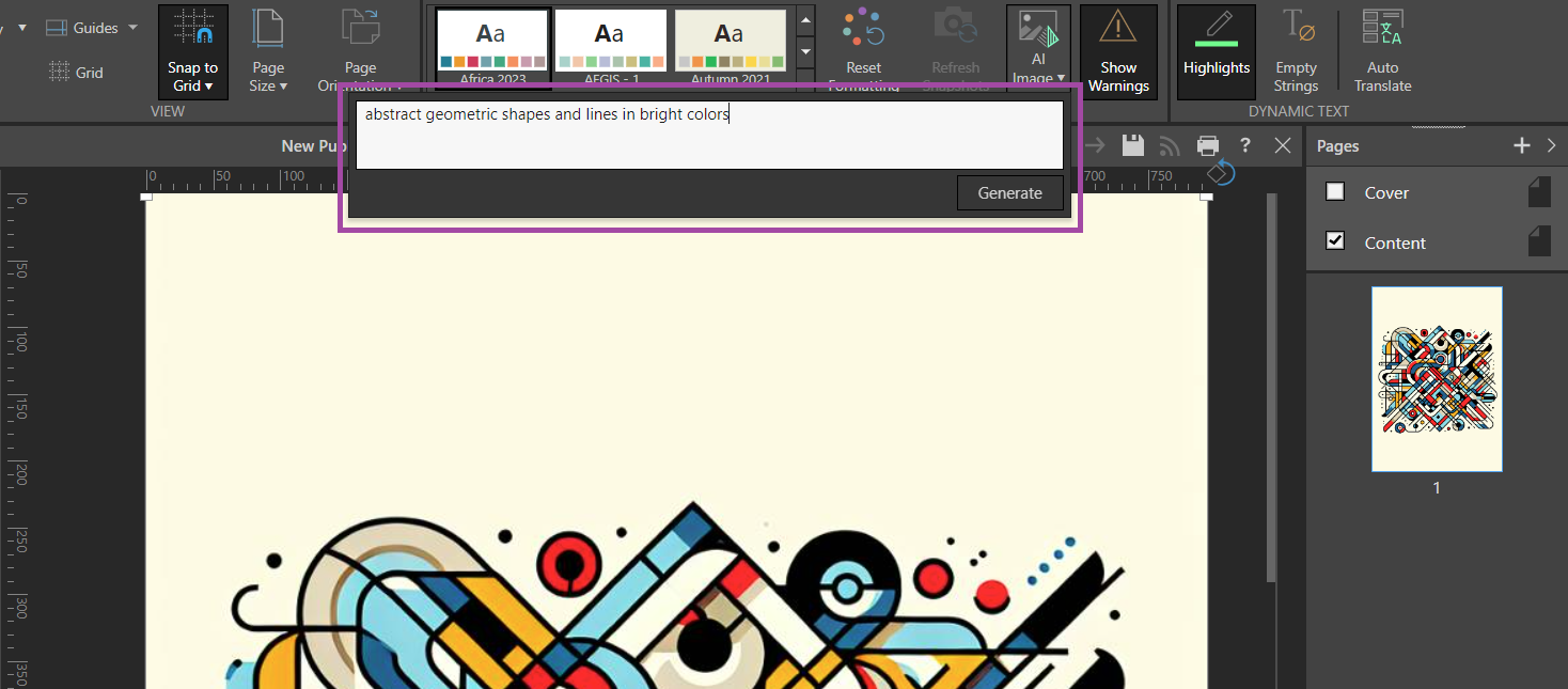 Use integrated generative AI functionality to generate images for publications. This can help you to quickly and easily design your publications, adding background and custom graphics based on a natural language prompt. Simply enter your prompt into the image generator to return an image.