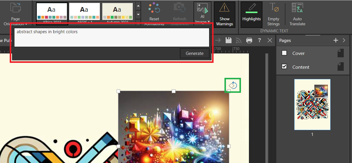 As with other content items, generated images can be resized, repositioned, and rotated. This is done by selecting the image and dragging the container handles or rotation tool (green highlight above), or by using the tools in the Component ribbon.