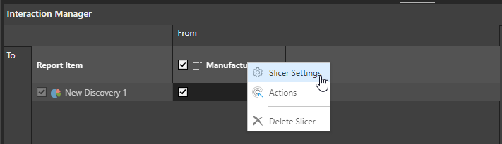 Right-click the slicer in the Interaction Manager and select Slicer Settings from the context menu. The Slicer Settings panel opens.