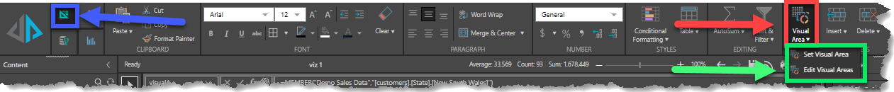 - From the Tabulate Tab (blue highlight), click on the Visual Area (red highlight), and select Set Visual Area (green highlight).