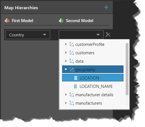 From Map Hierarchies, click the plus sign to choose the hierarchies that should be mapped. You can add multiple hierarchy mappings here. Each hierarchy mapping should contain the two corresponding hierarchies from each of the given models.