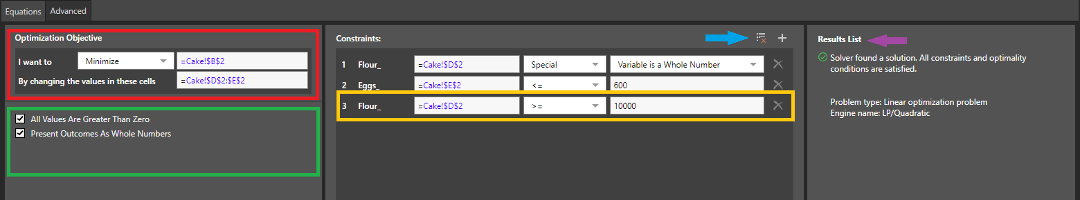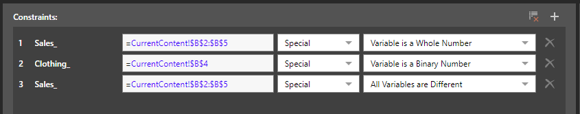 Note: Quick constraints and constraints may conflict! If a quick constraint defined in the Optimization Objective panel and an explicit constraint defined in the Constraints panel conflict (for example, where "All Values Are Greater than Zero" is selected but one of the cells also has a <= -3 constraint), the explicit constraint takes precedence over the quick constraint. Where the constraints are not in conflict, they both apply.