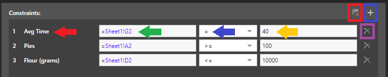 The objective function (red) states the value that you want to optimize, and how you want to optimize it. This can be by finding a maximum value for it, minimizing it, or finding a particular value for it. These options also specify which variables the Solver can change in order to optimize your objective value.
