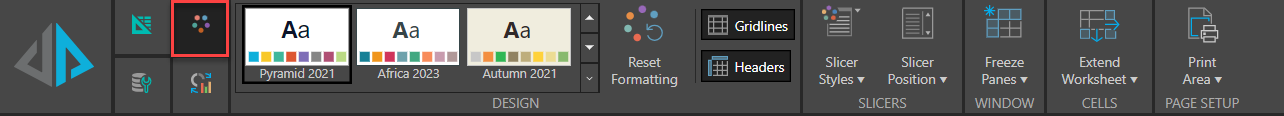 - Design Area: Applies one of the predefined Themes. Also resets the Formatting to the default settings, and enables or disables gridlines and headers.