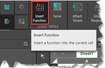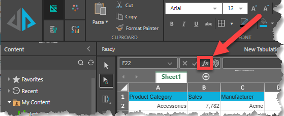Functions are predefined formulas that perform calculations by using specific values, called arguments, in a particular order, or structure. Functions can be used to perform simple or complex calculations. You can find all of Tabulate's functions by clicking the Function button on the ribbon above the Tabulate worksheet: