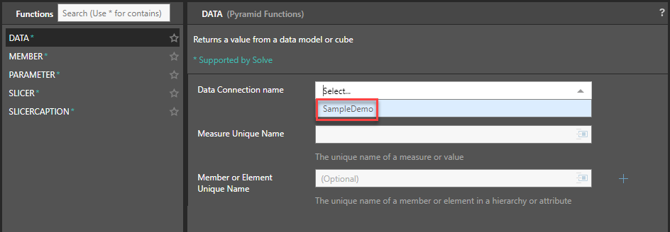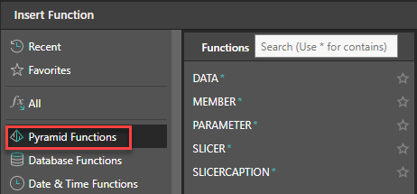 Select Pyramid Functions to retrieve the data query functions (data, member, parameter, slicer, slicercaption)