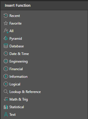 - Function name. For a list of available functions, click a cell and click the function button (shown above), which will launch the Insert Function dialog.
