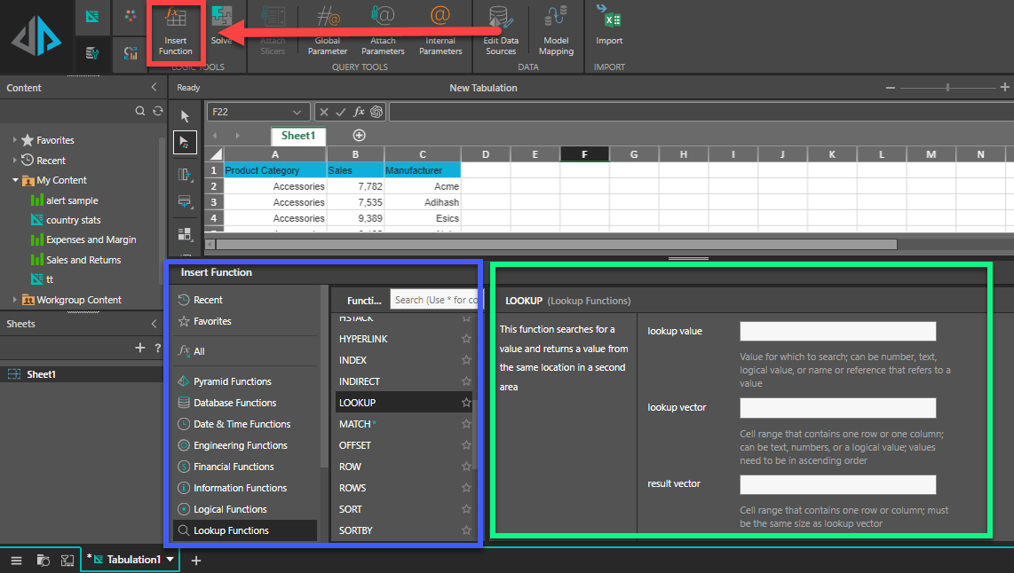 When you create a formula that contains a function, you can use the Insert Function dialog box (red highlight) to help you enter worksheet functions. Once you select a function from the Insert Function dialog (blue highlight), Tabulate will launch a function wizard (green highlight), which displays the name of the function, each of its arguments, a description of the function and each argument, the current result of the function, and the current result of the entire formula.