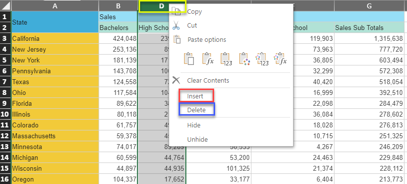Note: You must right-click the column header (A, B, C, D, and so on) and not one of the column cells.