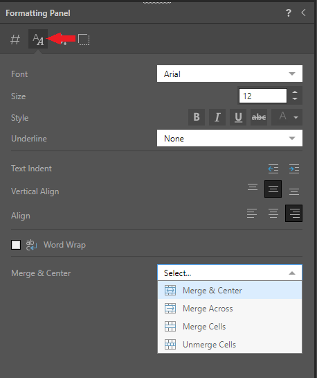 - Merge & Center: Combine and center the contents of the selected cells into a larger cell. Note: When you merge cells that contain data, only the content in the upper left or left-most cell is preserved. When you unmerge cells, you return to the state before the cells were merged.