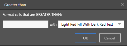 Enter the criterion to be tested in the left text box. In this case, we are testing whether the selected cell value is GREATER than the specified criterion. From the right drop-down menu, select the cell and text formatting to be used when the condition is met.