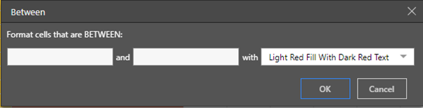 Enter the criteria to be tested in the text boxes. In this case, we are testing whether the selected cell value lies BETWEEN the specified criteria. From the right drop-down menu, select the cell and text formatting to be used when the condition is met.