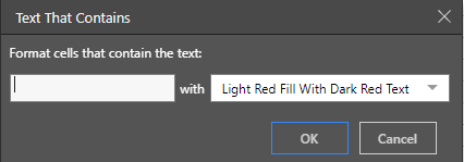 Enter the text value in the left text box. This value will be used to test if it is contained in the select text. In this case, we are testing whether the selected cell value CONTAINS any text specified. From the right drop-down menu, select the cell and text formatting to be used when the condition is met.