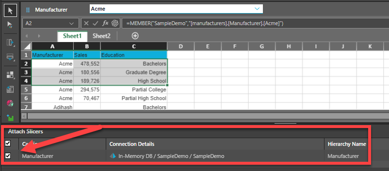 - Click Apply. The selected slicer is attached to the selected cells and appears above the worksheet.