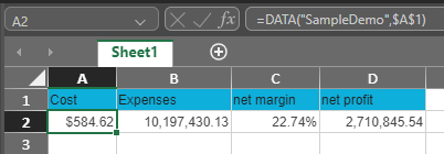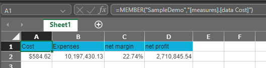 The cells in the first row are Measures and are Members of the SampleDemo data source.