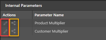 - Share (orange box): Save the quick parameter to the content manager. Once it has been saved, it will no longer appear in the Internal Parameters panel.