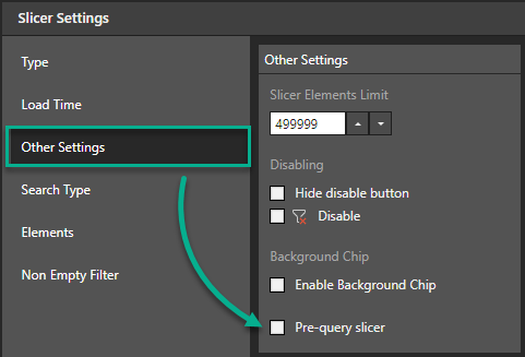 From the Other Settings tab, enable pre-query slicers (green arrow below):