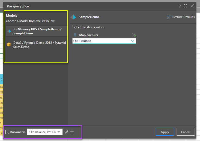 - Next time you open the Pre-query Slicers dialog, your bookmark will appear in the Bookmarks drop-down list. Select the required bookmark and click "Apply" to load the query.