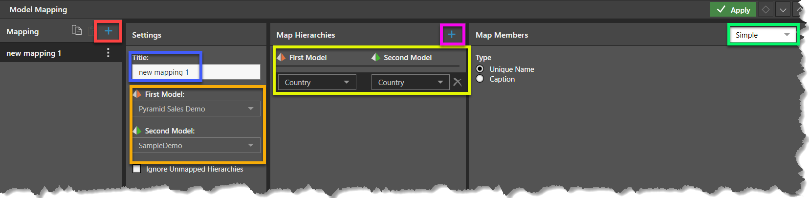 Select the type of mapping; if the hierarchies have different names, but the members within them are the same, choose Simple. If the members within the hierarchies are labeled differently, choose Advanced. Click Apply.