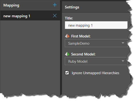 From the Mapping panel in the wizard, click the plus sign to create a new mapping. Under Settings, name the new mapping and then select the data models to be mapped.