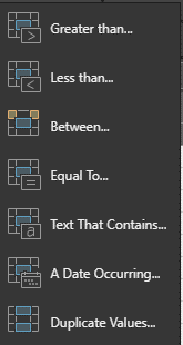To access the Highlighting rules, select the Highlight Cells Rules menu option. The following drop-down menu is displayed: