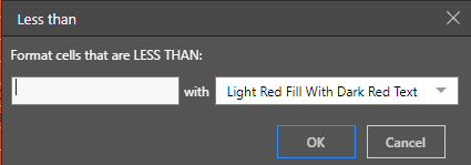 Enter the criterion to be tested in the left text box. In this case, we are testing whether the selected cell value is LESS than the specified criterion. From the right drop-down menu, select the cell and text formatting to be used when the condition is met.