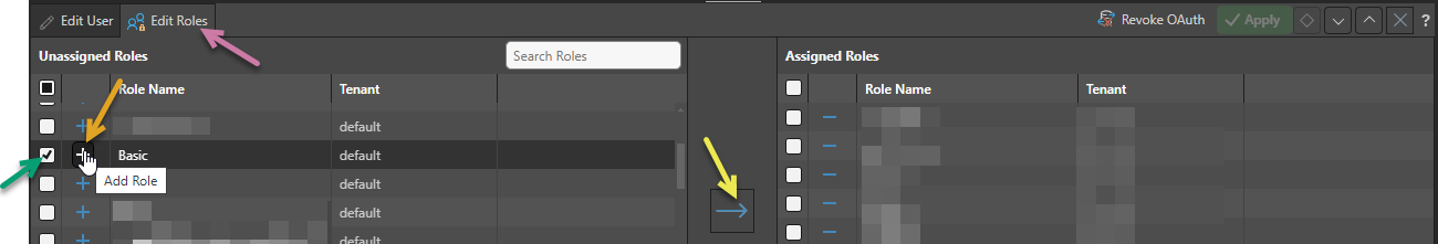 • To assign multiple roles, use the checkboxes to select the roles you want to assign (green arrow) and then click the right-pointing arrow (yellow arrow) to assign all of the selected roles.