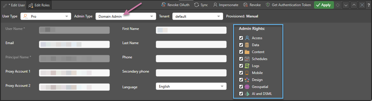 When adding or editing a user that is a Domain Admin (purple arrow below), you can select which parts of the Admin Console that user should have access to using the Admin Rights options (blue highlight):