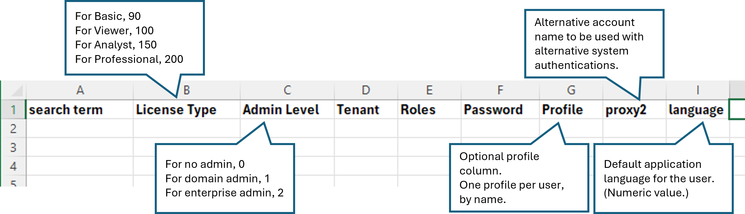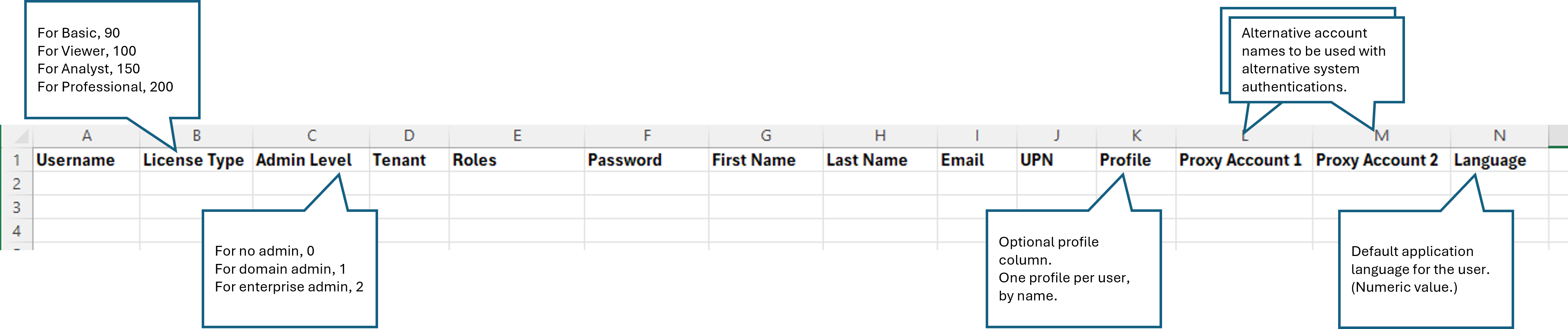 - Profile: The profile name as it appears in the system (optional). There can only be one profile per user. The profile must be compatible with the tenant and the license type. For more information, see Profiles.
