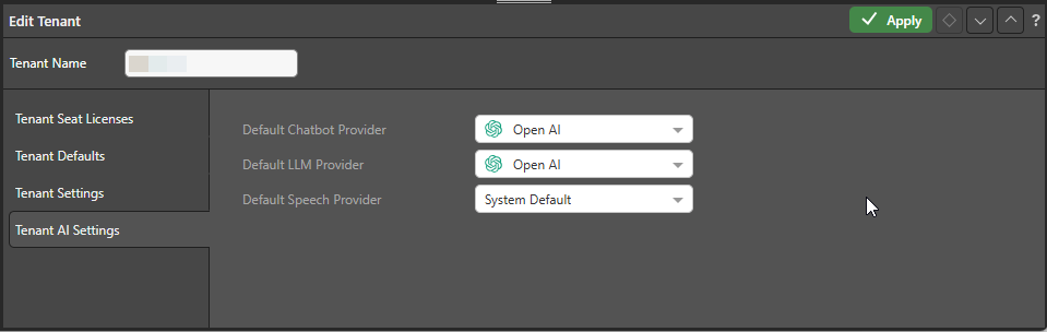 These providers enable the Chatbot, LLM Functionality, and Chatbot Speech to text, respectively. You can select from the following default options for this tenant: