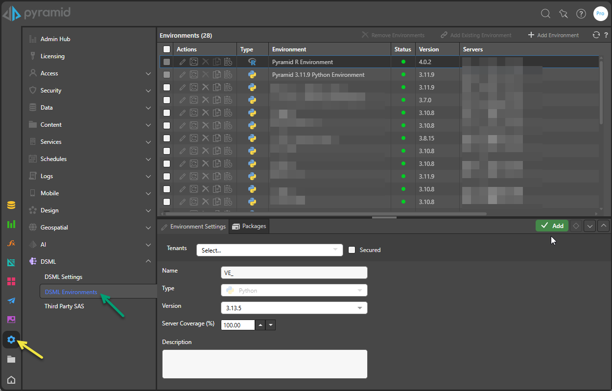 The "Pyramid Python Environment" and "Pyramid R Environment" are created during installation and may not be edited or deleted. However, they can be moved to operate on different AI servers.