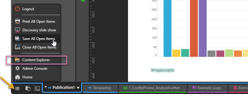 Once apps are opened (either by starting new sessions or opening existing content items), the application interface changes into App Tab mode. From here, you can open the Content Manager or to return to the home page using the App Tab Home Menu (orange arrow below).