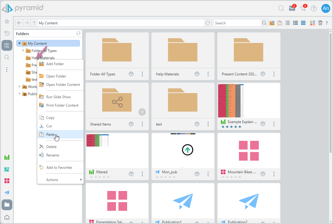 - Right-click a folder in the tree and Paste from the context menu to paste the items into that specific folder: