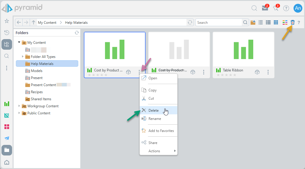 The user accesses the Delete function using the context menu for either the content item or folder in the Content Manager or in the folder tree (purple arrows below). Selecting Delete will immediately delete the item WITHOUT prompt. However, these deletes are "soft" deletes and the selected items can be restored by admins.