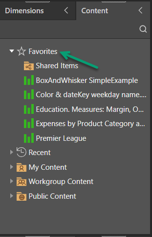 By default, Favorites is the first view users see when accessing the Content Manager, provided they have marked items or folders as favorites. Favorites typically appears at the top of the CMS toolbox (indicated by a green arrow in the main view) and can be configured as the Default Content View for Pros or Admins opening the CMS.