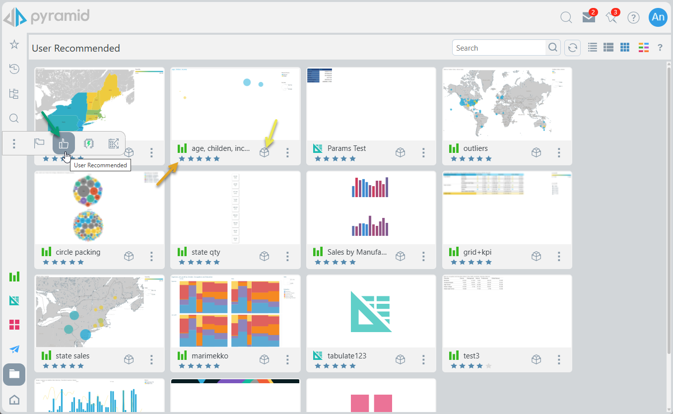 The User Recommended view itself is only available in the Content Manager and is represented by a Thumbs-up icon. For both the Pro and Analyst versions of the CMS, this icon is hidden by default. You need to click the ellipsis menu to show the submenu.