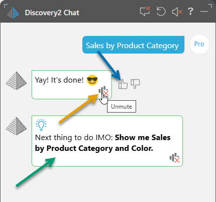 If your prompt was the first question asked in the Chatbot session and it created a visual on an empty canvas, you can use the thumbs up and thumbs down icons to like or dislike the result (blue arrow). Liking a result promotes the associated question up the list of type ahead suggestions the next time you open the same model and influences which questions are recommended in the user community using the current model.