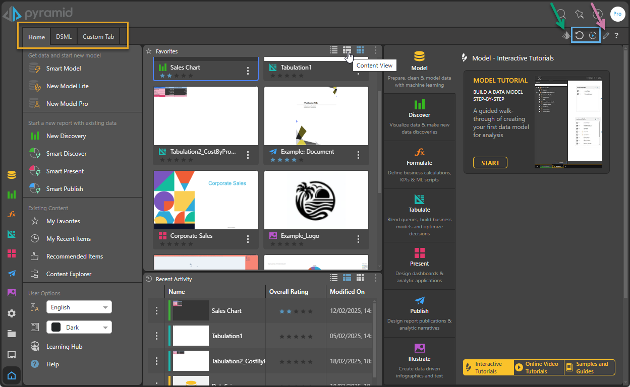 - Welcome: Opens the Quick Start and Learning Center dialog, letting Pro users quickly start new Model and Discover sessions or jump to the Content management tools.