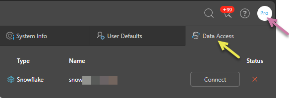To open the Data Access panel, click the User Details & Settings button (indicated by the purple arrow below) from the Home menu:
