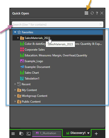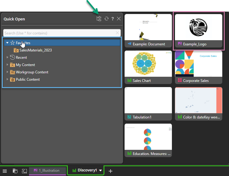 Quick Open (green arrow below) opens a quick view of the content explorer, where you can easily navigate around the content items available to you in the Content Manager and open those items in a new Tab.