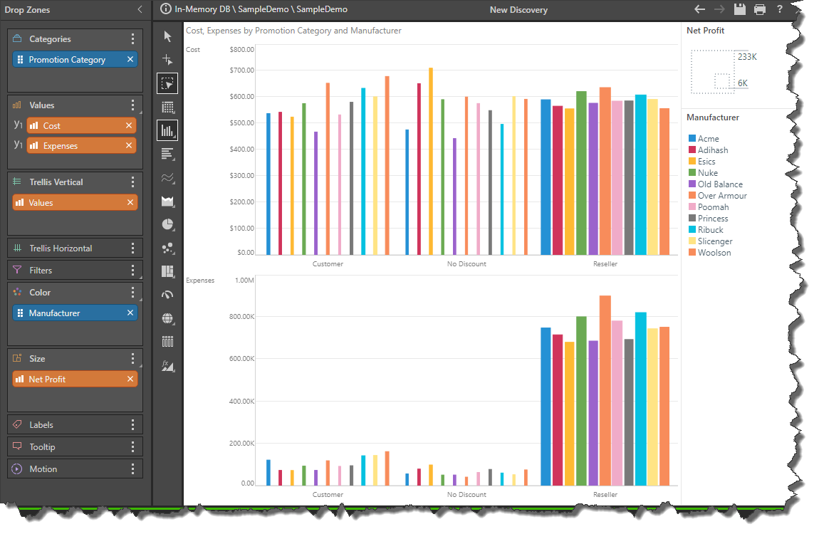 To use the Size zone, add a single measure. In the example below, the Net Profit measure was added to the Size zone of a trellised column chart. The result is that the column size in both charts is driven by the net profit for the hierarchy in the Categories zone (which, in this case, is Promotion Category).