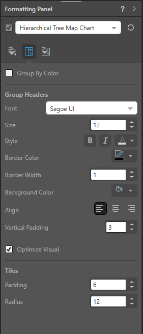 When working with Tree Maps and Hierarchical Tree Maps, you can change the background color from the Formatting panel. You can also adjust the headers for Hierarchical Tree Maps.