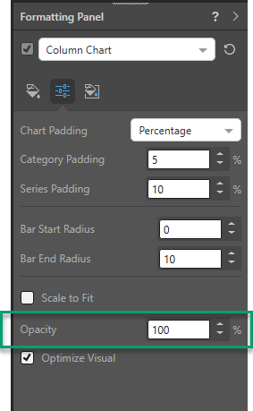 The opacity of all charts can be adjusted from the Settings tab in the chart's formatting panel (green highlight below).
