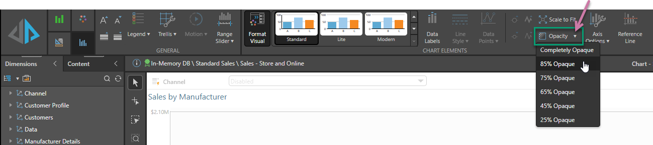 You can also change the opacity of most charts (not including gauges and maps) directly from the Component ribbon: