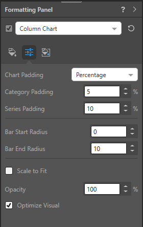 - Bar Start Radius: This radius setting affects the corners of the shape at its start point. For a bar chart, this is where the bar meets the y-axis. For a column chart, this is where the column meets the x-axis.
